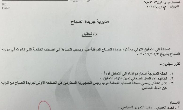وكانت صحيفة الصباح العراقية الرسمية قد اعتذرت رسميا في بيان لها عن خطأ غير مقصود ارتكبته الجريدة بذكرها اسم نواب رئيس الجمهورية في مقابلة مع رئيس هيئة النزاهة بينما كان المقصود نواب رئيس الوزراء.