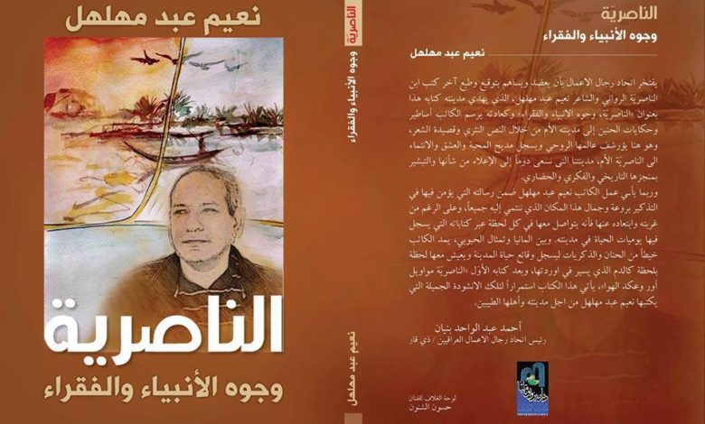 ومن هذا المكان المعطر بقدسية غامضة وغريبة يكتب مهلهل ايقوناته تحت عنوان ( الناصرية ــ وجوه الأنبياء والفقراء ) والصادر بمشروع النشر المشترك بين دار نينوى في دمشق ودار ميزوبوتاميا في بغداد . والكتاب رؤيا طفولة المكان وسحره والممتلئ بعطر تواريخ لا تحصى حيث يجاور المكان الامكنة الازلية للاهوار والتي شغف نعيم عبد مهلهل بالكتابة عنها وسجل أساطيرها بأمانة وعشق ونثر جميل .