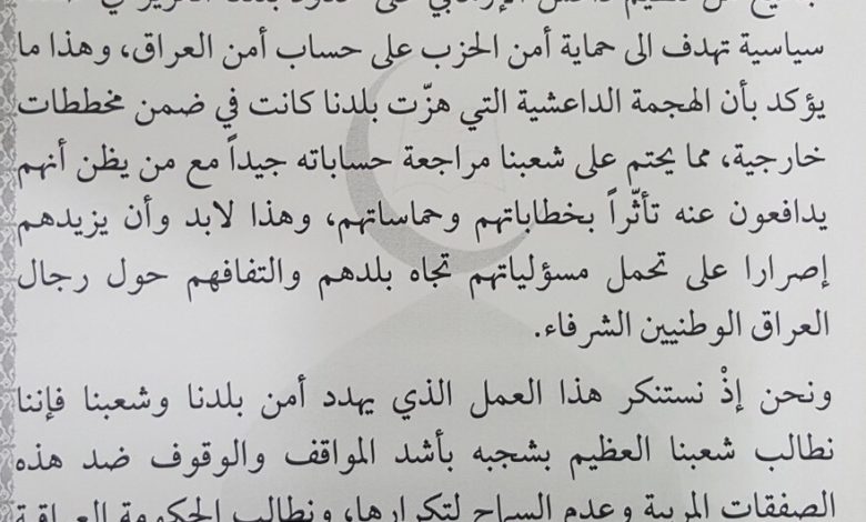 وحمّل الكعبي الحكومة العراقية والاجهزة الأمنية مسئولية الحفاظ على أمن وسلامة المرجع البديري، وفقاً لمسئولياتها القانونية، محذراً من ان اي استهداف لهذا المرجع العراقي العربي ستكون له عواقب غير محمودة .