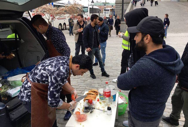 بالصور .. شاب عراقي يبادر بتوفير وجبات طعام الى المشاركين في تظاهرة طالب اللجوء العراقيين في ستوكهولم