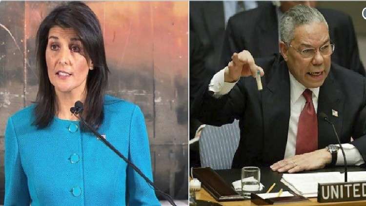 وتظهر الصورة الثانية وزير الخارجية الأمريكي الأسبق كولن باور وهو يهز بأنبوب اختبار زجاجي أمام أعضاء مجلس الأمن قائلا إنه يحتوي على مادة من ترسانة العراق الكيمياوية، التي كما تبين لاحقا كانت وهمية.