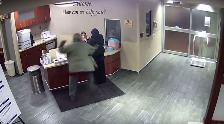 تعرضت شابة محجبة لهجوم عنيف أثناء وقوفها أمام مكتب للاستعلامات في أحد مستشفيات ولاية ميشيغان الأمريكية، حيث اندفع نحوها رجل أمريكي فجأة من الخلف وانهال عليها باللكمات بوحشية.