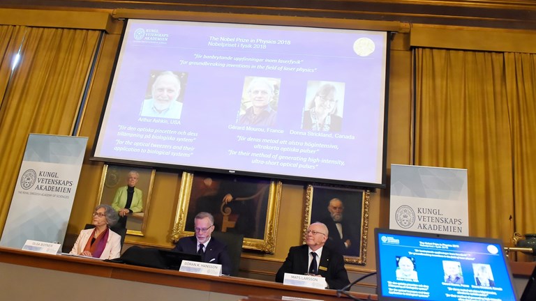 أعلنت الأكادمية السويدية الملكية للعلوم اليوم عن اسم الفائز بجائزة نوبل للفيزياء لعام 2018، حيث كانت الجائزة من نصيب كل من الأميركي لآرثر أشكين، الفرنسي جيرارد مارورد و الكندية دونا ستريكلاند، عن اكتشافهم الرائد وبحوثهم في أشعة الليزر.