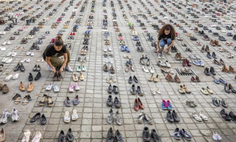 وقال أعضاء حركة «آفاز» العالمية المعنية بحقوق الإنسان وأنشطة أخرى، الذين وضعوا الأحذية، إنها مقدمة من متبرعين على مستوى أوروبا، وتمثل كل حياة أُزهقت في الصراع خلال العقد الأخير.