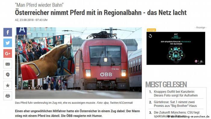 ذكر موقع صحيفة "فرانكفورته ألغيماينه" أن رجلاً نمساوياً ركب أمس الأربعاء (22 أغسطس/ آب 2018) القطار برفقة حصان كان معه. وأضاف الموقع الألماني أن الرجل وحصانه اضطرا بعد وقت قصير إلى النزول من القطار في محطة قريبة من جبال الألب في النمسا، فيما لم تتضح بعد أسباب إقدام الرجل على اصطحاب الحصان معه إلى القطار.