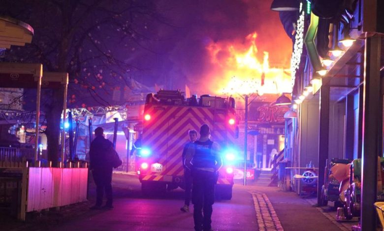 إندلع حريق كبير في احد المطاعم بمدينة للملاهي في شمال الدنمارك مساء اليوم الاربعاء.