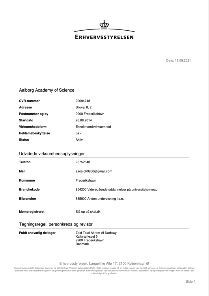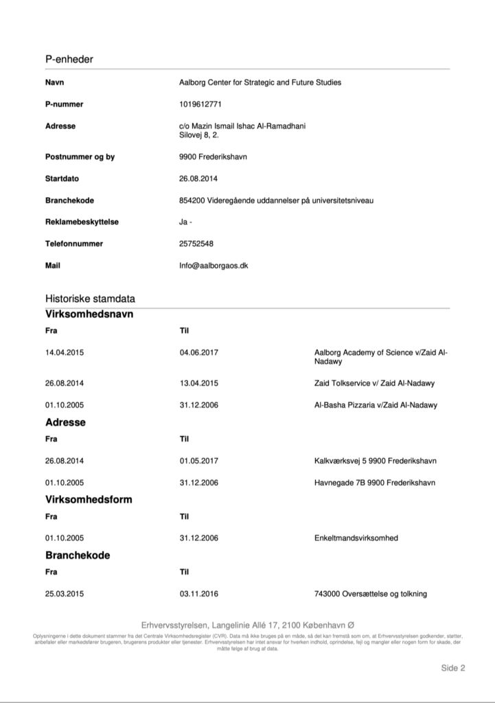 وتشير الوثائق الخاصة بتسجيل الشركات في الدنمارك الى ان الرمضاني مسجل رسمياً في الشركة كرئيس لمركز الدراسات.