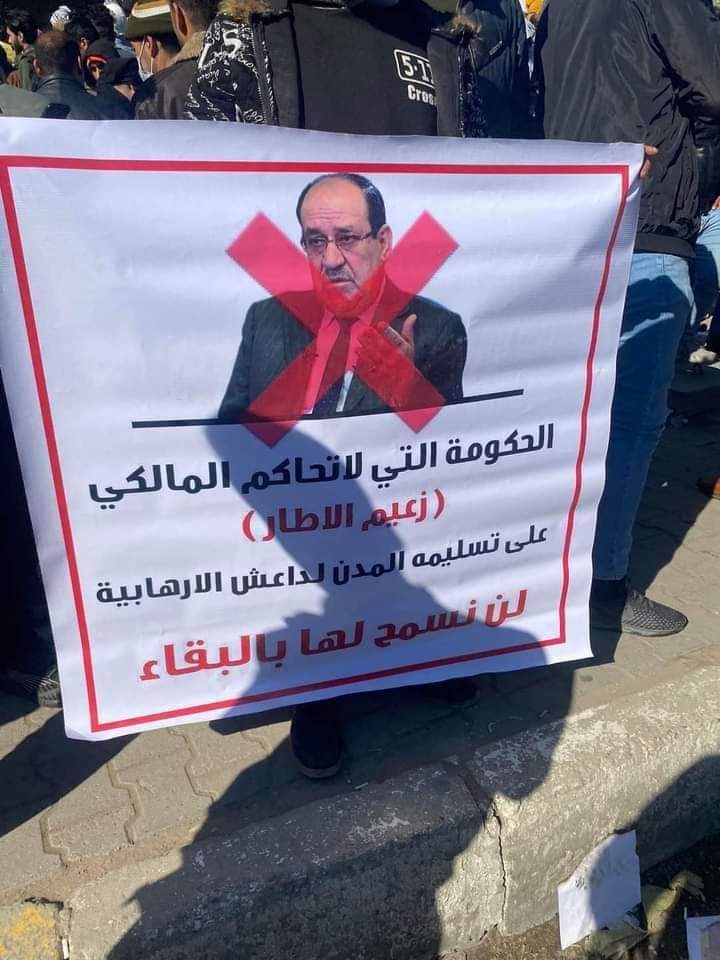 ورفع المتظاهرون شعارات قالوا فيها ان المالكي تسبب بأحتلال تنظيم داعش الارهابي للعديد من المدن العراقية ، وان من واجب أي حكومة جديدة تشكل مستقبلا ان تحاكمه على الجرائم التي ارتكبها بحق الشعب العراقي ، بالاضافة الى الفساد الذي شهدته البلاد خلال ثماني سنوات من حكمه.