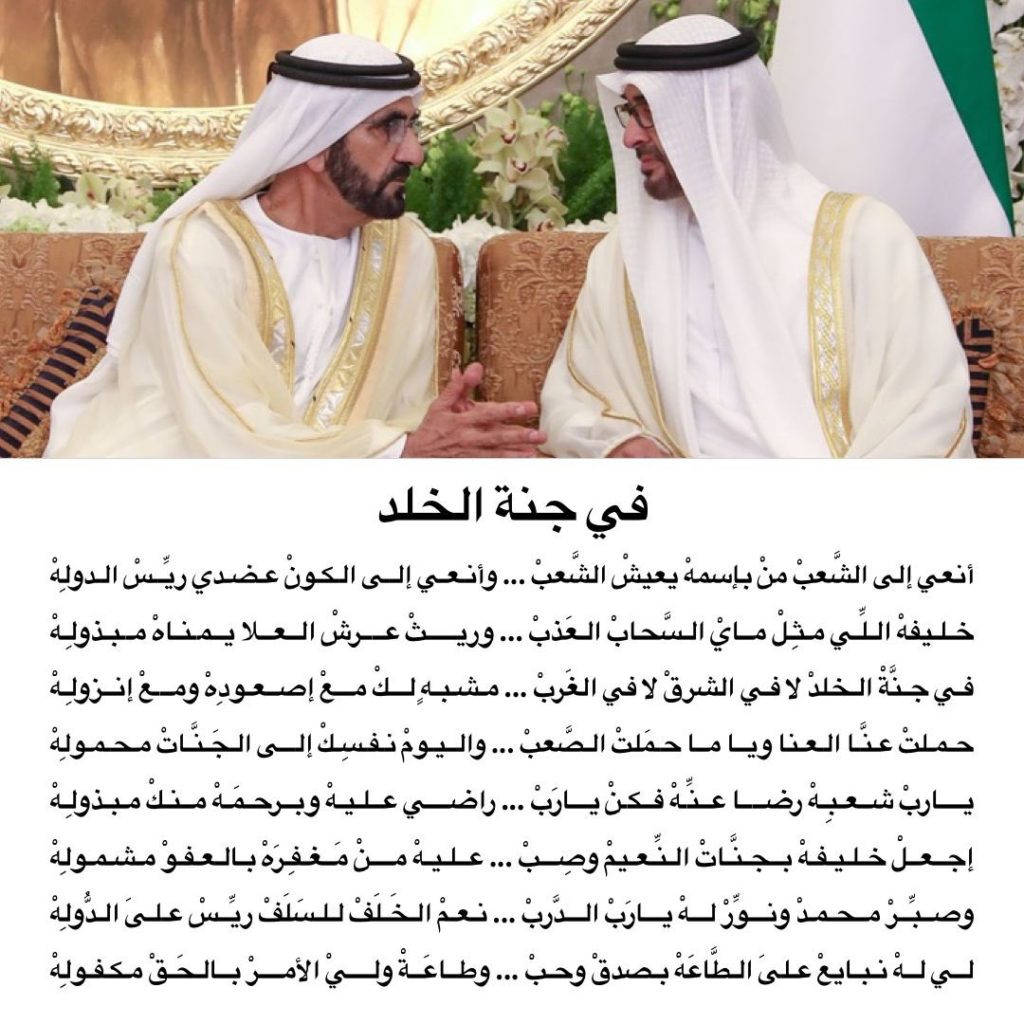 جاء ذلك خلال قصيدة كتبها الشيخ محمد بن راشد آل مكتوم نعى فيها رئيس الدولة الشيخ خليفة ، وختمها بمبايعة الشيخ محمد بن زايد آل نهيان رئيسا للدولة ، وقال انه خير خلف لخير سلف.