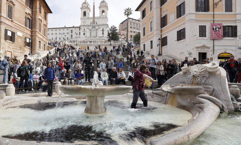 رمى نشطاء بيئيون سائلاً أسود في مياه نافورة رومانية في ساحة “بياتزا دي سبانيا” بالعاصمة الإيطالية روما، خلال احتجاج تحدّثوا فيه عن سيناريو “نهاية العالم”.