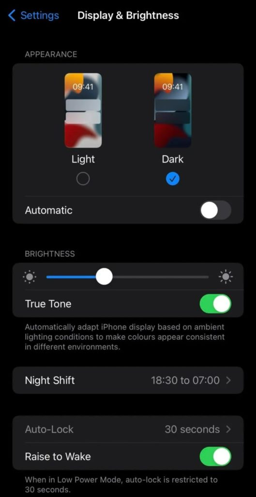 يجعل الوضع الداكن جميع صفحات آيفون، التي تظهر عادةً باللون الأبيض أو الرمادي الفاتح، تظهر باللون الأسود بدلاً من ذلك.