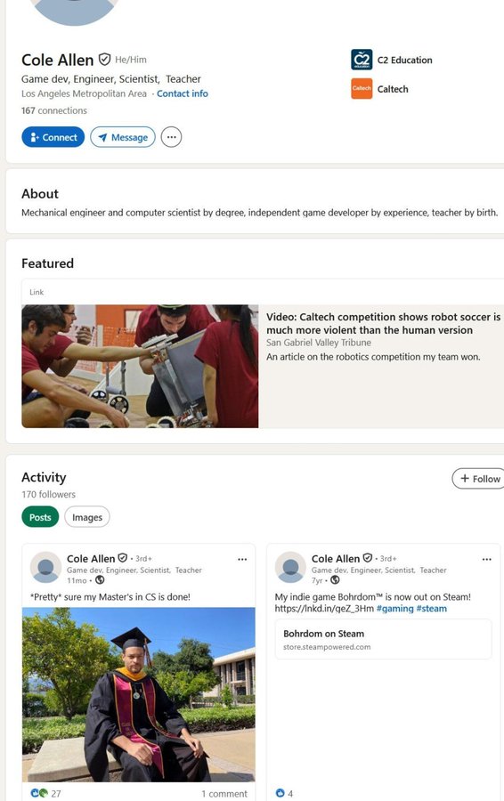 وتظهر حساباته على منصات التواصل الاجتماعي اهتمامًا بمجالات التكنولوجيا والألعاب، حيث يصف نفسه بأنه “مهندس وعالم ومطور ألعاب”، كما نشر مؤخرًا صورة احتفالية بمناسبة إكمال درجة الماجستير في علوم الحاسوب.
