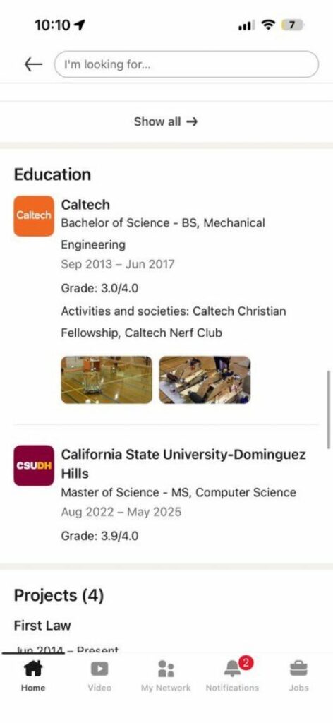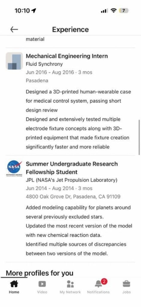 كما أظهرت سيرته الذاتية حصوله على زمالة بحثية صيفية في مختبر الدفع النفاث التابع لوكالة ناسا، حيث شارك في مشاريع علمية مرتبطة بالنمذجة الفضائية.