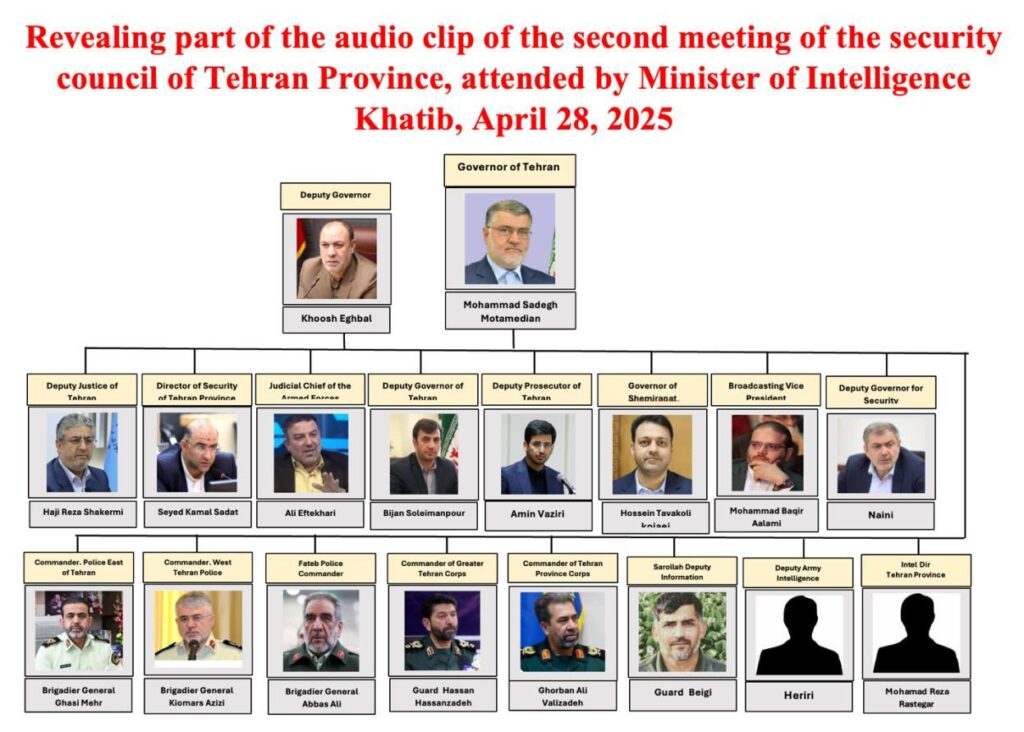 ومن بين ما كُشف عنه، عرضت المعارضة تسجيلًا صوتيًا لاجتماع مجلس الأمن في محافظة طهران بتاريخ 28 أبريل/نيسان 2025، بحضور وزير الاستخبارات إسماعيل خطيب ومحافظ طهران وقادة من الحرس الثوري وقوى الأمن والقضاء.